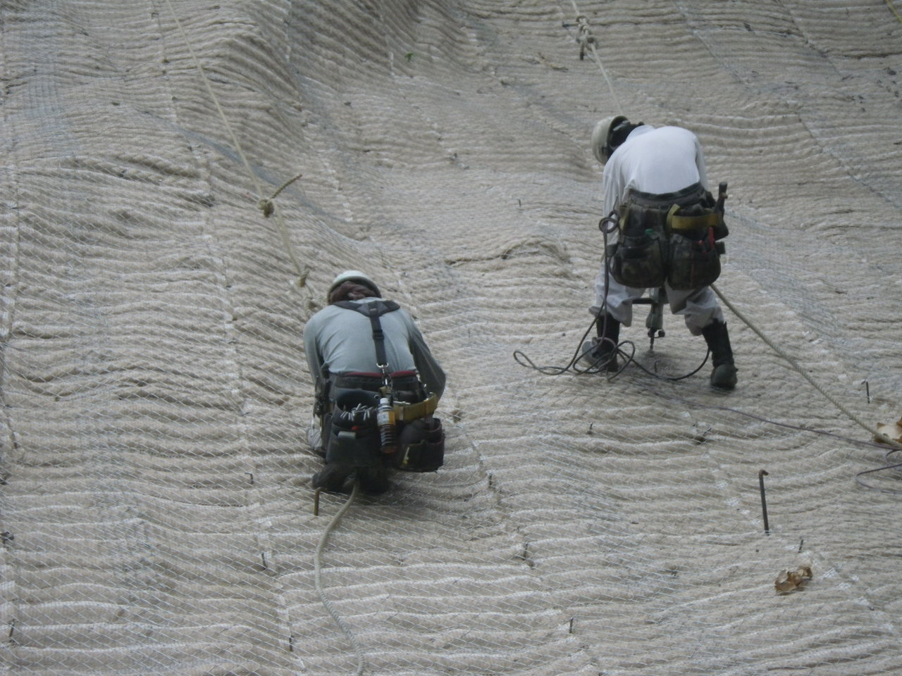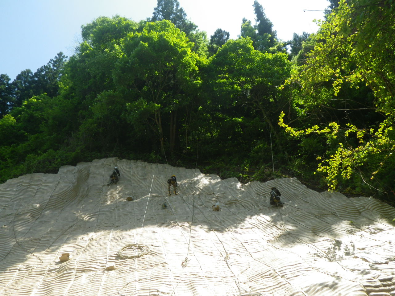 植生マット工事とは、種子・肥料などを含んだ厚みのあるネットを法面全体に広げ、アンカーや釘で固定する工事のことです。自然環境保全や法面保護を行なう植生のことです。
